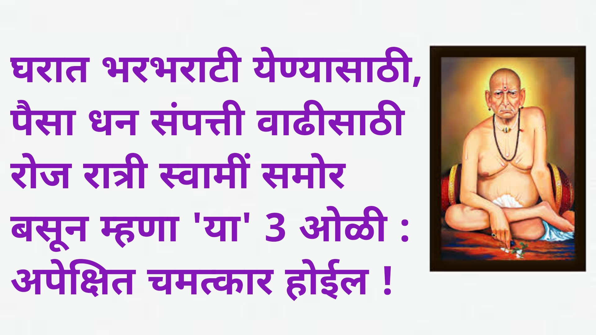 आपण तर स्वामींना बोलणारच आहोत, ‘’स्वामी आमच्या घरावर तुमची कृपादृष्टी राहू द्या. आमच्या घरामध्ये सुख समृद्धी समाधान आरोग्य ऐश्वर्य सर्वकाही नांदू द्या. नोकरी, उद्योगधंदा यात यश मिळून आमच्या घरामध्ये धनसंपत्ती पैसा यात बरकत होऊ दे.’’