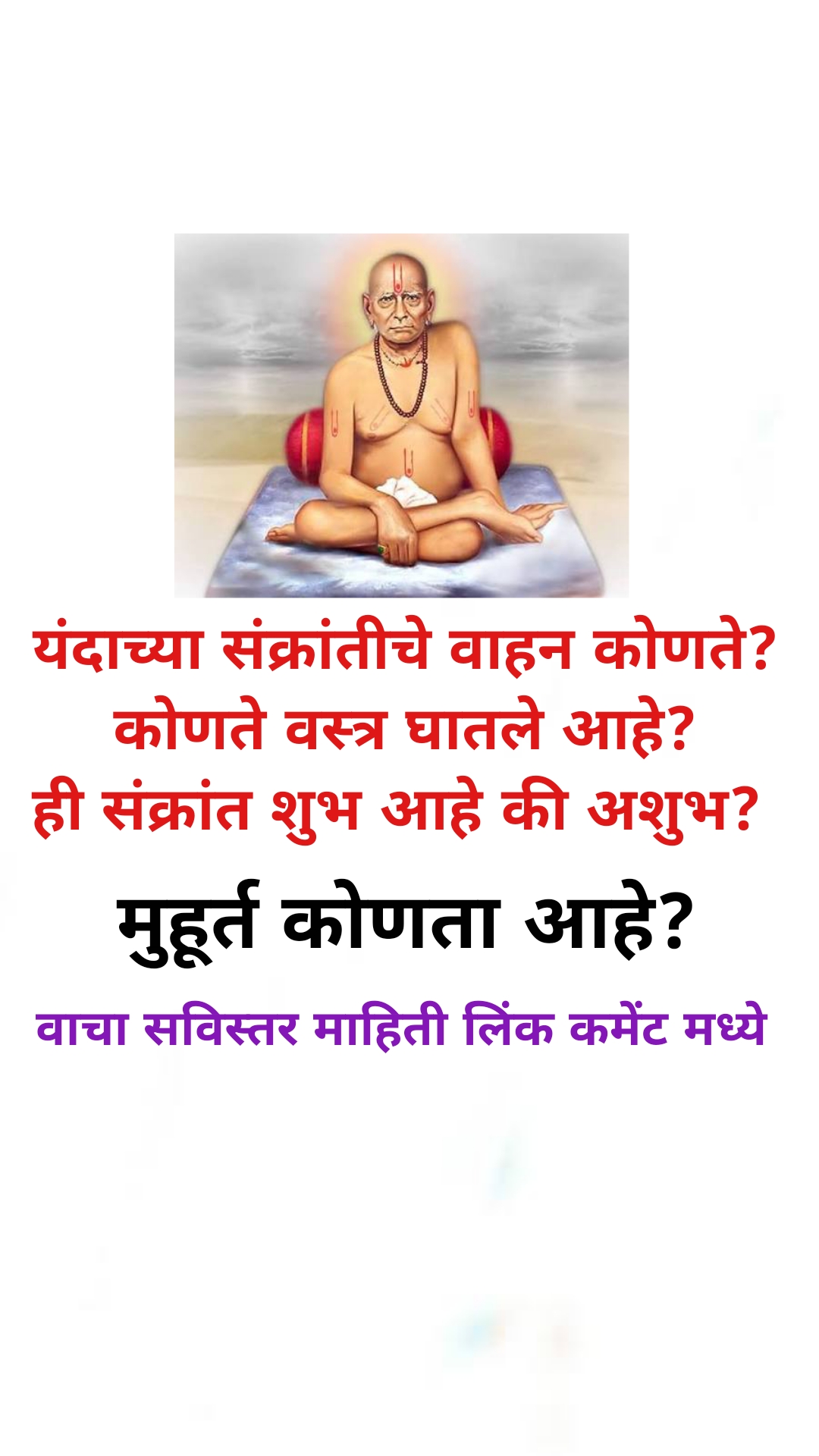यावर्षीच्या मकरसंक्रांतीचे वाहन वाघ आहे तसेच उपवाहन अश्व आहे. तिच्या हातात गदा रुपी शस्त्र आहे. ती पूर्व दिशेकडे जात आहे. तिने पिवळ्या रंगाचे वस्त्र घातलेले आहे. मकर संक्रांतीचा मुहूर्त 14 जानेवारी दिवशी पुण्यकाळ वेळ हा दुपारी 2 वाजून 12 मिनिटांनी सुरू होऊन तो संध्याकाळी पाच वाजून 45 मिनिटांपर्यंतआहे. या वेळची मकर संक्रांति ही सर्वांसाठीच शुभ आहे. सर्वांचेच कल्याण करणारी आहे. परंतु फक्त आपल्या मेहनतीची परीक्षा घेतली जाणार आहे.