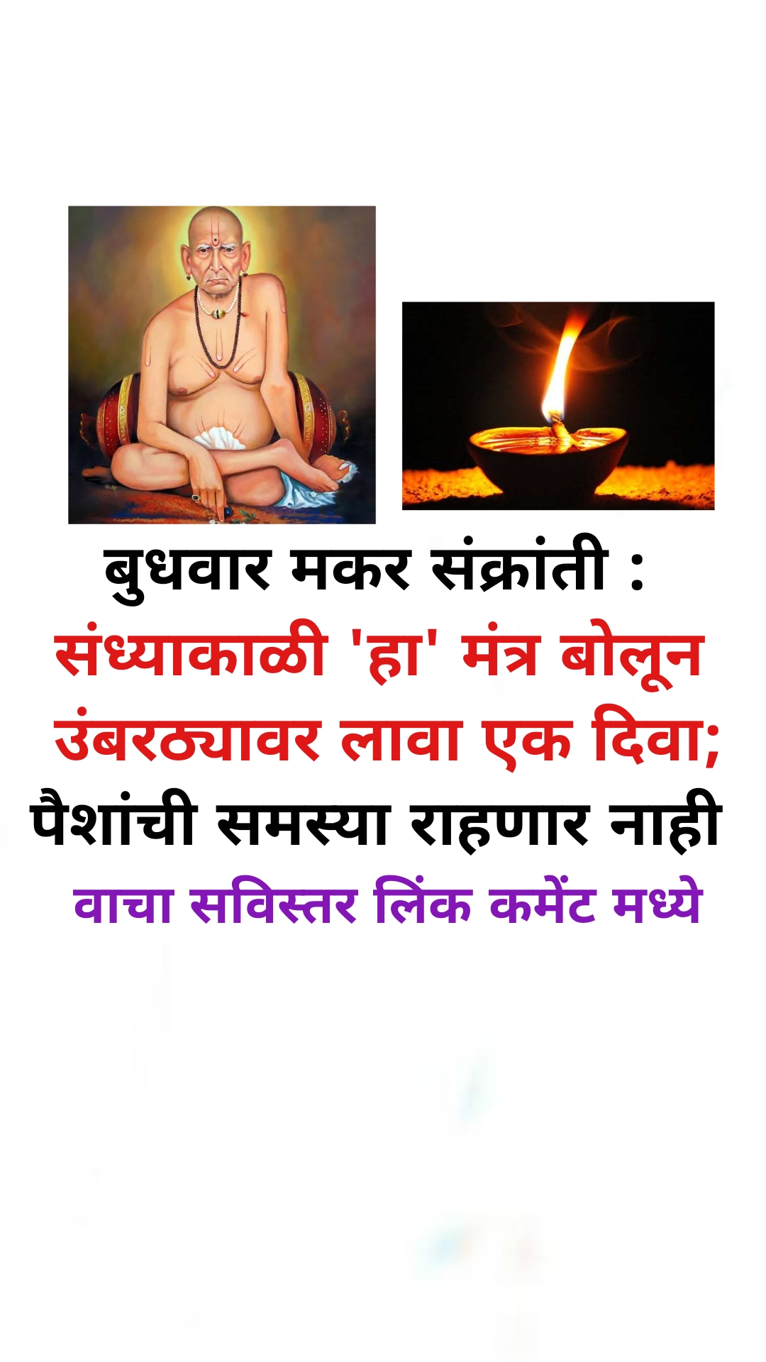आणि हा दिवा लावल्यानंतर श्री महालक्ष्मी नमः, श्री महालक्ष्मी नमः हा मंत्र तिथे अकरा वेळा म्हणा. अशा पद्धतीने आपणाला मकर संक्रांतीच्या दिवशी दिवा लावायचा आहे. मात्र हे लक्षात ठेवा की दिवा हा उंबरठ्यावर लावायला हवा. त्यामुळे नक्कीच माझा लक्ष्मी आपला पसंद होईल आपल्या पैशाच्या ज्या काही अडचणी असतील त्या दूर होतील. आपण यशस्वी बनाल.