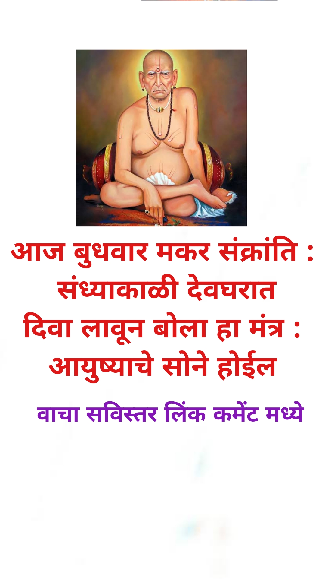मित्रांनो आज मकर संक्रांतीला बुधवारी संध्याकाळी आपण आपल्या देवघरासमोर किंवा आपल्या घरात जिथे देव असेल त्या ठिकाणी बसून हा मंत्र आपणाला म्हणायचं आहे. हा मंत्र माझा लक्ष्मीचा असून तो म्हटल्याने आपणाला नक्कीच माता लक्ष्मी प्रसन्न होईल. आपल्या येणारा पैसा अडका सर्व काही ठीक सुरू होईल. आपल्या घरात सकारात मुक्त वाढवून नकारात्मकता दूर होईल. परिणामी घराची सातत्याने प्रगती होत राहील.