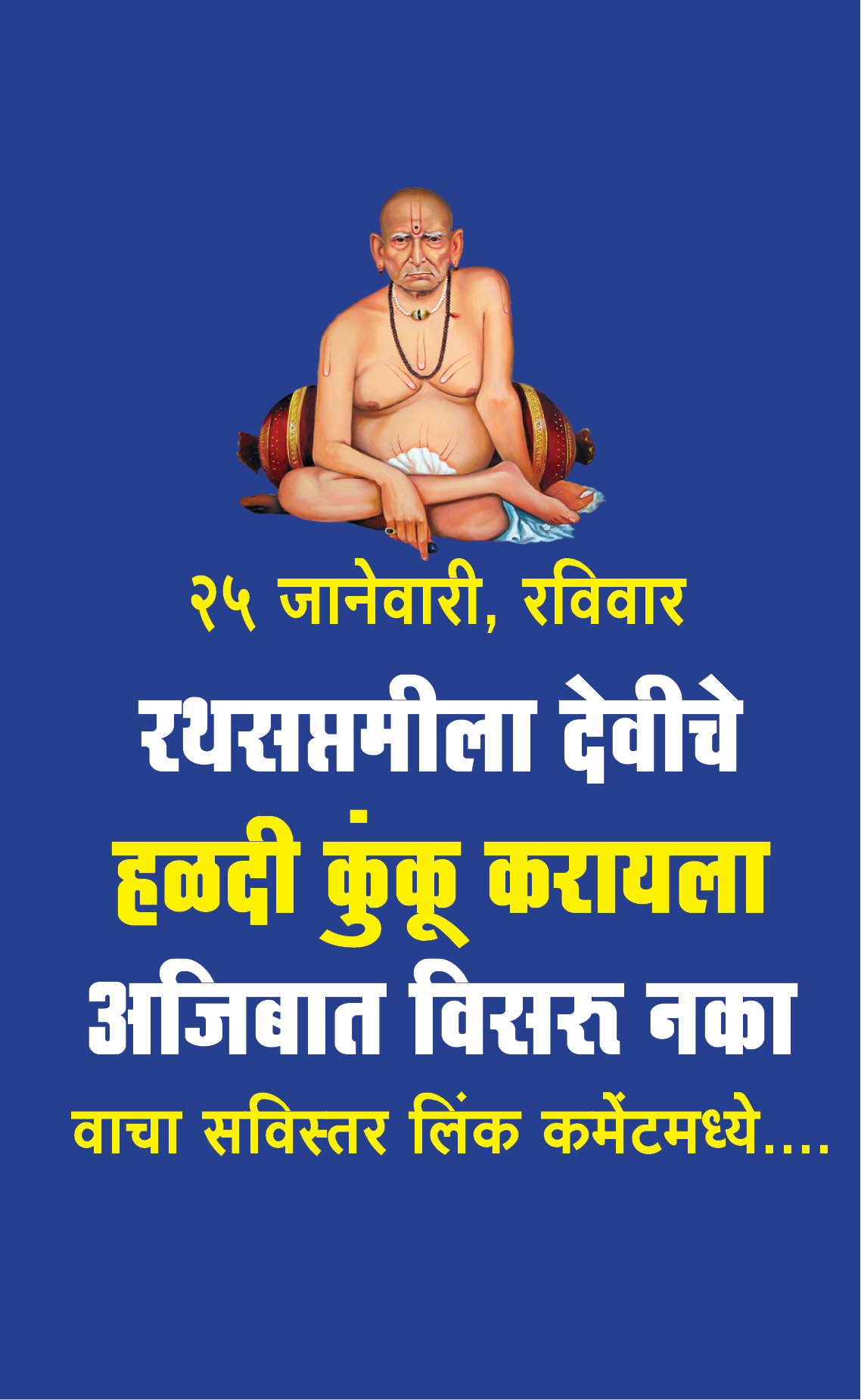 आजच्या धावपळीच्या जीवनात सणांचे महत्त्व विसरले जात असले तरी रथसप्तमीसारखे पवित्र दिवस आपल्याला संस्कार, श्रद्धा आणि एकतेची आठवण करून देतात. त्यामुळे २५ जानेवारी, रविवार – रथसप्तमीच्या दिवशी देवीचे हळदीकुंकू करायला अजिबात विसरू नका. श्रद्धेने केलेली ही छोटीशी पूजा तुमच्या जीवनात मोठे सकारात्मक बदल घडवू शकते.